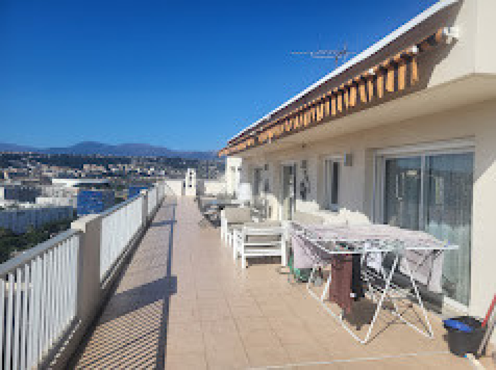 APPARTEMENT SUR TOIT AVEC TERRASSE DE 310m² Secteur quartier Mathis. NàGOCIABLE Idéalement situé , au dernier étage d'un immeuble , cet appartement traversant entièrement rénové de 108 m² offrant un cadre de vie raffiné et lumineux. Des volumes généreux , des finitions soignées en font un bien rare sur le marché Niçois. Grande Terrasse carrelée de plus 310 m² avec vue à 360 ° Mer et Montage Dès l'entrée, la pièce de vie baignée de lumière dévoile un espace chaleureux et sophistiqué. Le salon spacieux, bénéficie d'une double exposition qui sublime chaque instant de la journée. La cuisine ouverte, entièrement aménagée et équipée, Deux grands garages pouvant accueillir ( grosses berlines ). sans oublier ces deux caves . Situé à proximité immédiate des commerces, écoles et transports. Bien soumis au statut de la copropriété : 25 lots
